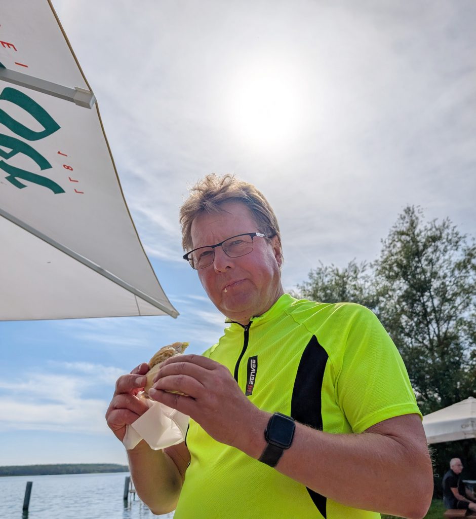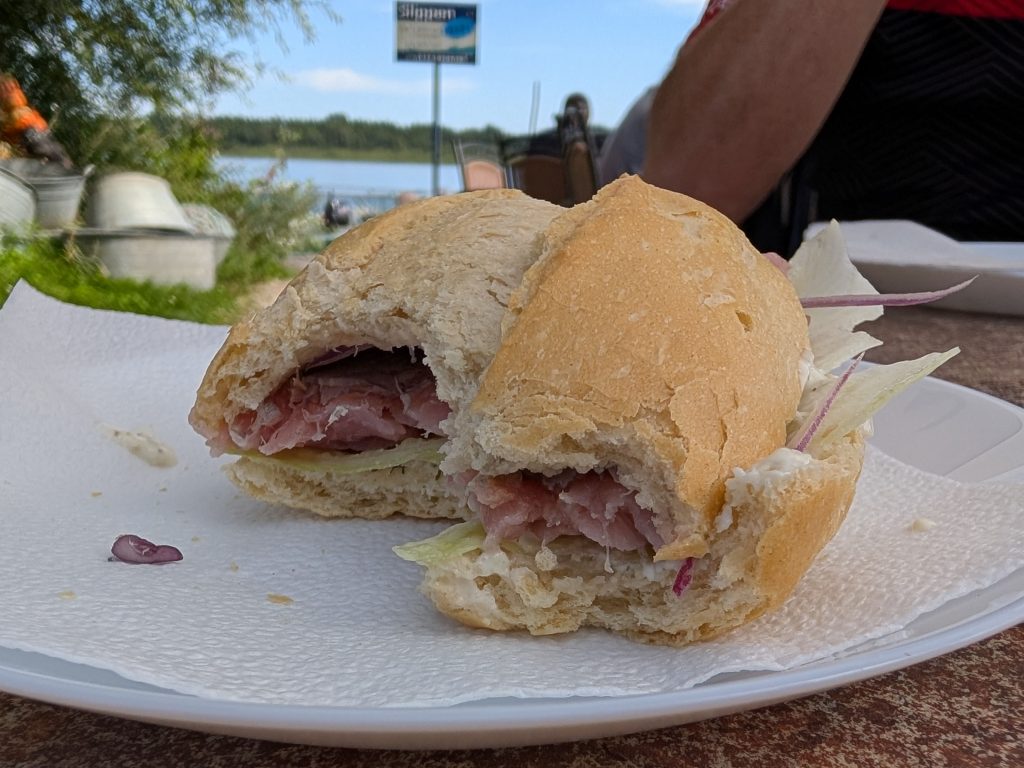 Die wilde Fahrt ging also weiter. Wir fuhren durch Bad Kleinen und schwupps waren wir in Hohen Viecheln am nördlichsten Punkt des Schweriner Sees. Dort gibt es einen Imbiss, an dem man Fischbrötchen und Pommes bekommen kann. Meine drei Mitfahrer entschieden sich für Fischbrötchen und ich mich für Pommes. Fisch ist nicht so meins. Leider waren keine Pommes mehr da! Na gut, dann aß ich eben meine mitgebrachte Banane…