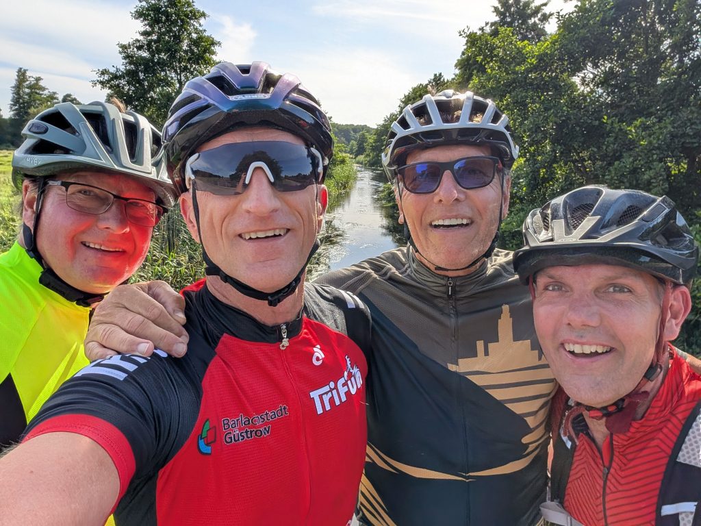 Nun, der Peter hatte einen Traum. Er wollte irgendwann einmal mit dem Rennrad um den Schweriner See fahren. Er fragte Klaus-Dieter nach einer tollen Route. Der klinkte sich aber gleich mit ein, so dass er und Peter gemeinsam fahren wollten. Schließlich hat Peter Ferien und Klaus-Dieter hat sowieso immer frei. Dann fragten die beiden Molle und mich, ob wir auch Lust und Zeit zu dieser Tour hätten. Bei uns ist’s ja nicht ganz so einfach, schließlich müssen wir arbeiten. Aber wir schaufelten uns den Montag Nachmittag frei und so stand der Rundfahrt nichts im Wege. Zumal die Wettervorhersage perfekt aussah, Sonne, knapp über 20°C und so gut wie kein Wind.
